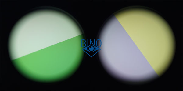 Хотя тест с поляризационным фильтром на просвет через объективы на монитор показал перепад в яркости между половинками апертуры небольшого уровня, заметно слабее, чем у Canon 8x32 WP, слабее, чем у Vixen SG 6.5x32, но сильнее (заметнее), чем у Zeiss Conquest HD 10x32. На фото ниже демонстрация перепада слева через правый канал, справа через левый: