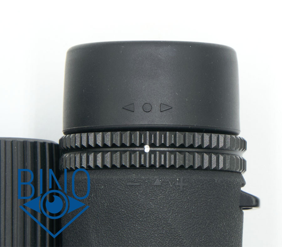 Диоптрийная коррекция выполнена на правом окуляре в виде пластикового кольца с рифлением, на левом окуляре расположено такое же по высоте гладкое кольцо под наглазником для симметрии. Вращение кольца диоптрийной коррекции скорее лёгкое (без ступенек), но не сбивается самопроизвольно. Поворот возможен на 70 градусов влево от нулевой метки и на 50 градусов вправо.
