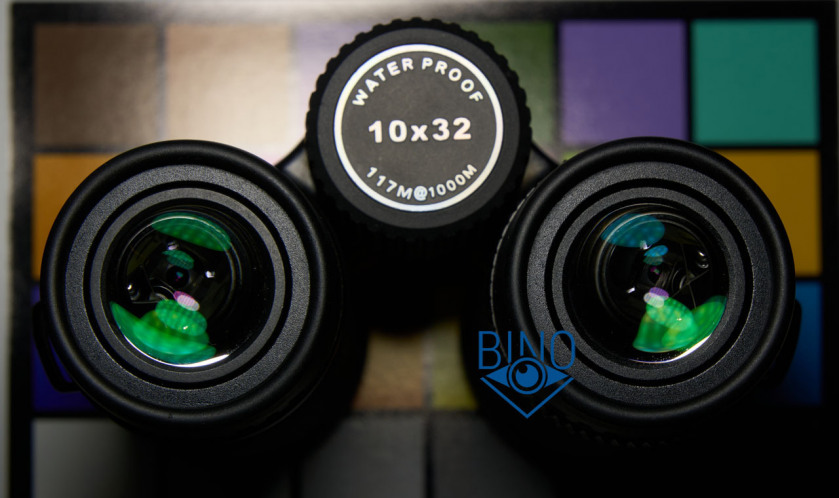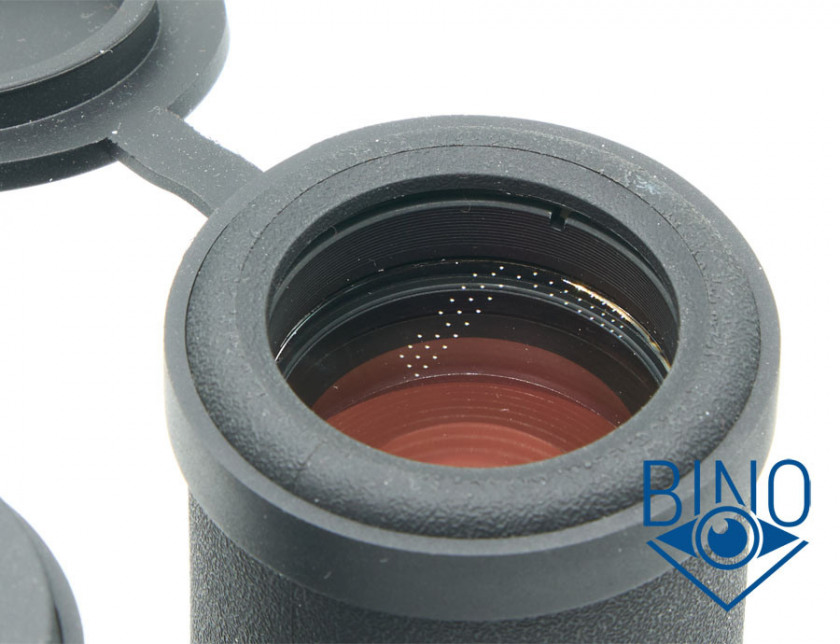 Просвет у стопорных колец объектива около 31,9мм, действующая апертура по тесту фонариком получилась около 30мм. Наружная линза объектива немного выпуклая, утоплена от края тубуса внутрь на 9,2мм по центру и на 9,7мм по краю. Обрезинка загибается вокруг торца тубусов, формируя хороший бампер - постановка бинокля на стол мягкая. Снаружи объектива на стопорном кольце есть нарезка светозащиты, дальше она встречается на подвижном цилиндре перед фокусирующей линзой, светоотсекающих диафрагм внутри не видно. Внутренности тубусов выполнены нормально, с достаточным серением поверхностей, призменная диафрагма окрашена, а вот тубусы внутри за подвижным цилиндром с фокусирующей линзой, похоже, нет. Торцы наружной линзы объектива зачернены и расположены шире оптического тракта, есть поблескивание по окружности, как-будто не хватает просветлений по краю этой линзы.