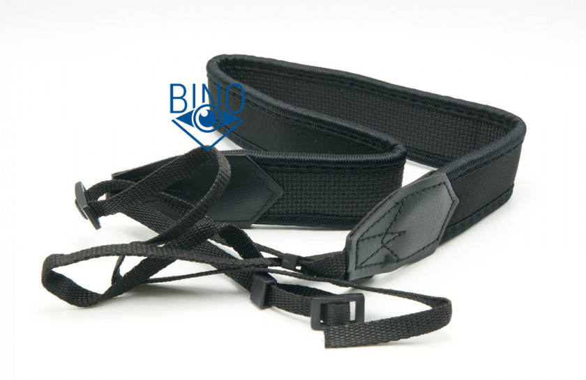 Нашейный ремешок неопреновый, простой по качеству, но хорошо тянется. Шириной 35мм и толщиной 5мм, покрыт тканью только с наружной стороны. Он подходит для разгрузки шеи от веса этого вполне лёгкого бинокля (545гр). Хотя для длительного ношения летом лучше использовать ремешок пошире, в другие сезоны носить бинокль, заправив ремешок за воротник куртки, нормально. Проушины для ремешка по бокам тубусов достаточно выступают наружу для продевания в них тесёмок ремешка.