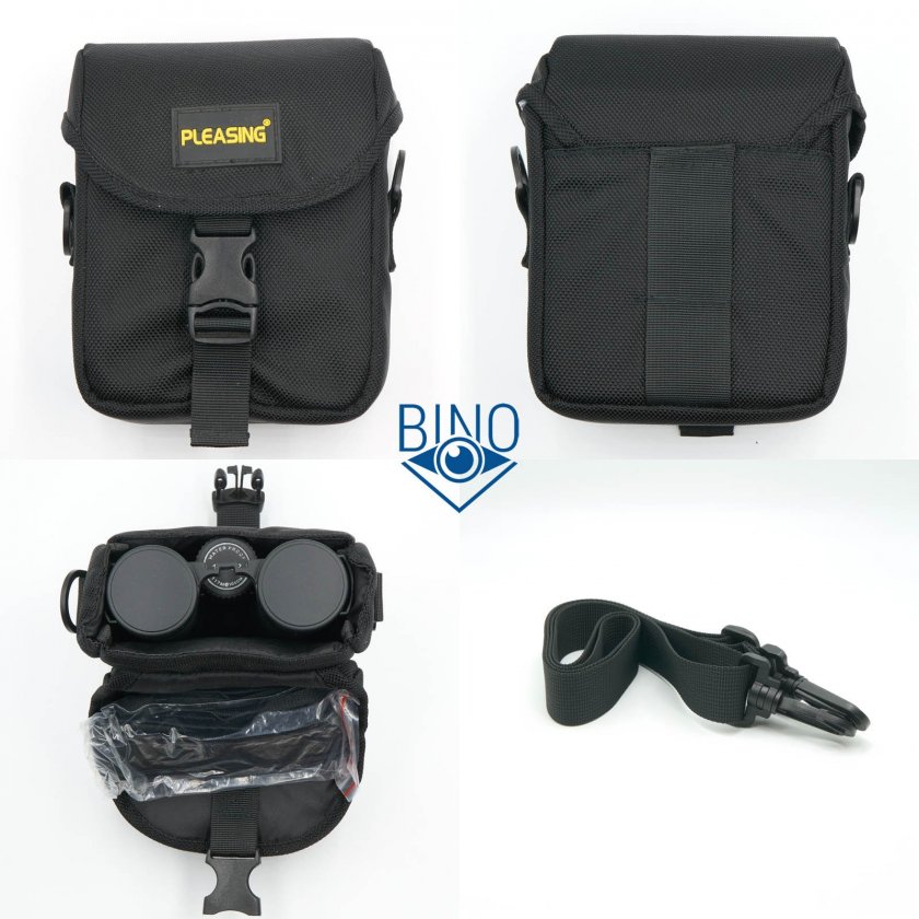 Комплектная сумка синтетическая, стенки с хорошим уплотнением для защиты от ударов, крышка закрывается на защёлку. По исполнению и толщине стенок сумка похожа на кордура-кейс у Zeiss, вполне вероятно, что с неё и копировалась. С выкрученными наглазниками бинокль помещается в сумку, внутрь можно убрать и нашейный ремешок, крышка закрывается. Для сумки есть отдельный ремешок на плечо, шириной 26мм, с тыльной стороны расположен хлястик для крепления на ремень шириной до 57мм.