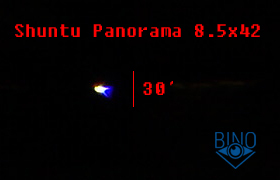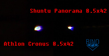 Хроматическая Аберрация (ХА) на оси у Panorama 8.5x42 небольшая (точно ниже среднего), увеличивается к краю, остаётся на среднем уровне. ED-стекло в объективе скорее всего есть, выглядит всё неплохо: ХА на оси у Panorama 8.5x42 слабее, чем у Canon 8x32 WP, чуть слабее, чем у Nikon E 8x30 или у Zeiss Conquest HD 10x32, но сильнее, чем у Hinode D1 8x42. Если смотреть ночью по ярким белым фонарям, немного расфокусировав их, внефокалы также сильнее окрашены у Panorama, чем у D1.