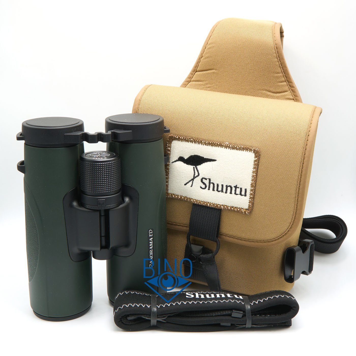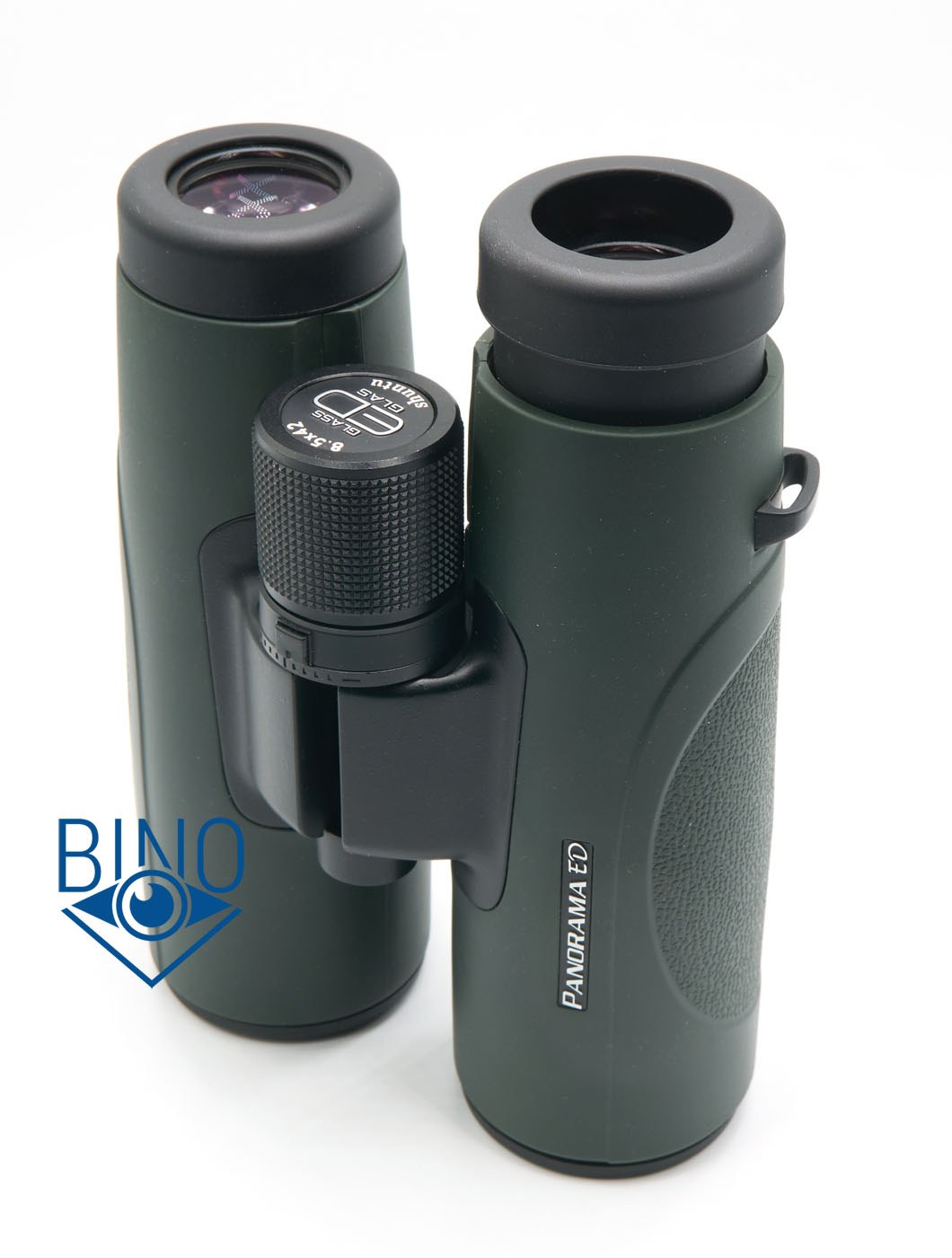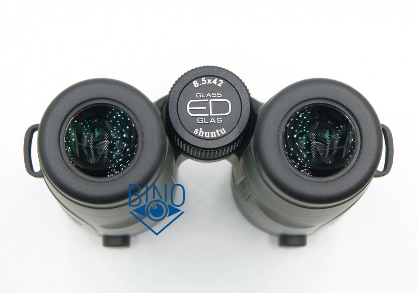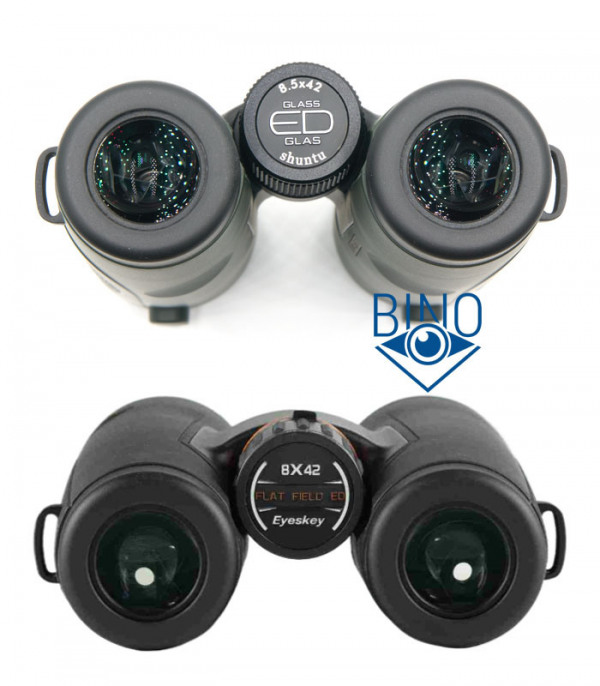 Если хочется оптику с гарантийным обслуживанием, то в РФ есть официальные дилеры марки Eyeskey, их сайты легко найти в Интернете. Мне удалось сравнить в магазине Shuntu Panorama ED 8.5x42 и Eyeskey SkyPower 10x42 - в наличии была только 10-ка. Бинокли этих марок схожи по характеристикам и внешнему виду, именно эту модель легко опознать по колесу диоптрийной коррекции, расположенному под колесом фокусера. Бинокли отличаются покрытием колеса, ход фокусера был чуть туже у SkyPower. Обрезинка обоих биноклей толстая, немного отличается рельефом. Ещё из внешних отличий надо отметить 3-х позиционные наглазники у SkyPower, в то время, как у Panorama наглазники делают только один фиксированный шаг наружу (2-х позиционные). Экземпляр от Eyeskey показался чуть более аккуратно собранным, у него было чуть лучше выполнено матирование внутри тубусов и прокрашена призменная диафрагма. Также при смене дистанции фокусировки обе линзы в SkyPower двигались синхронно. Больше отличий, кроме кратности, я не увидел, по оптике это были два одинаковых бинокля с хорошей коррекцией ХА на оси и отличным исправлением края поля.