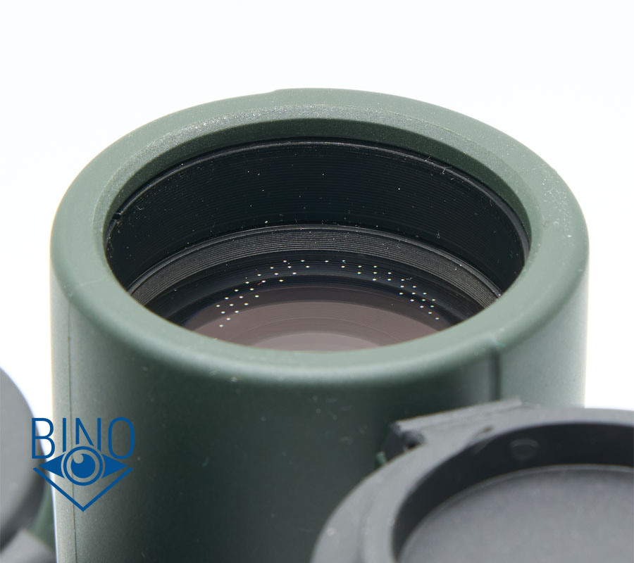 Просвет у стопорных колец объектива около 41,2мм, действующая апертура по тесту фонариком получилась около 40мм. Наружная линза объектива немного выпуклая, утоплена от края тубуса внутрь на 11мм по центру и на 12мм по краю. Обрезинка загибается вокруг торца тубусов, формируя хороший бампер - постановка бинокля на стол мягкая, несмотря на его вес. Снаружи объектива на стопорном кольце сделана очень мелкая нарезка светозащиты, дальше она встречается на подвижном цилиндре перед фокусирующей линзой, есть одна светоотсекающая диафрагма в объективе. Внутренности тубусов выполнены нормально, с достаточным серением поверхностей, призменная диафрагма, похоже, не окрашена, как и тубусы внутри за подвижным цилиндром с фокусирующей линзой. Можно было бы и внутренние фаски всех диафрагм прокрасить, это бы улучшило светозащиту и контраст. Торцы наружной линзы объектива зачернены и расположены шире оптического тракта.