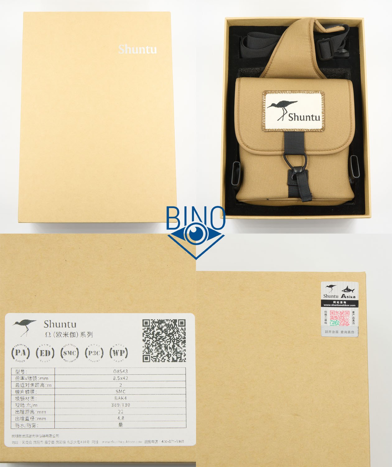 Бинокль поставлялся в коробке габаритами ДхШхВ 280х201х103мм и полным весом 1,7кг. Она изготовлена из плотного картона, внутри одно отделение. С тыльной стороны расположены две наклейки: одна с основными параметрами бинокля, вторая с логотипами компании Shuntu - Asika.