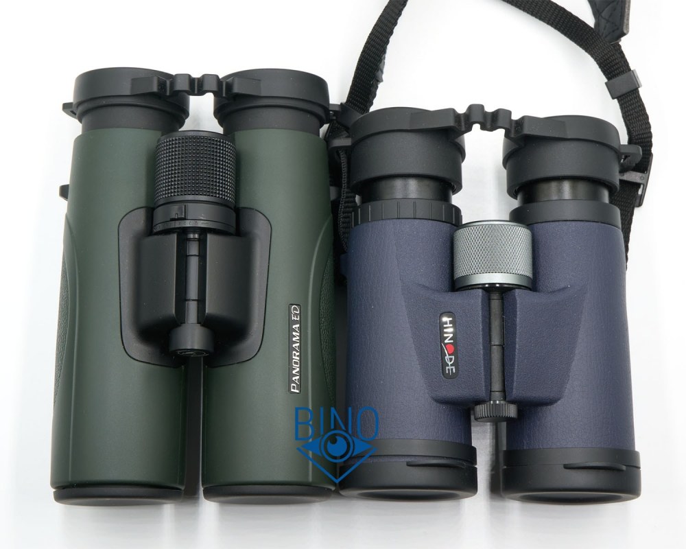 Габариты у бинокля неприличные для формата х42 по текущим меркам, ДхШхВ 157х120х65мм на МЗР=65мм, хотя он удобно ляжет даже в крупную руку. Стабильность картинки при наблюдениях хорошая, чуть лучше, чем у более компактных биноклей 8х42. На примере Hinode D1 8x42 (справа), который заметно легче и меньше, чем Panorama (слева) по габаритам, ниже фото для сравнения:
