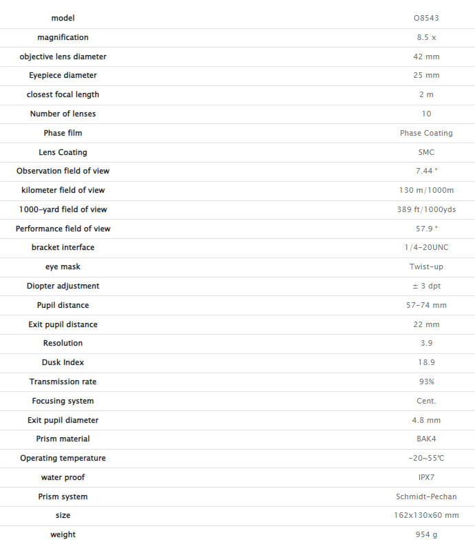 Вес бинокля: 910гр, 990гр с крышками и ремнём, 1125гр в сумке.