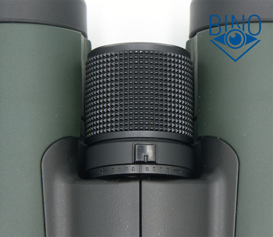 Колесо фокусера алюминиевое, диаметром 32мм на 29мм высоты. Поверхность выполнена с рифлением, сцепление с ним не очень хорошее, палец немного проскальзывает, но высоты колеса достаточно для вращения двумя пальцами. При случайном задевании колесо чуть сдвигается, хотя люфта в работе фокусера нет. Ход фокусера средней тяжести (или туже) и немного вязкий, в фокус я попадаю почти с первого раза. У этого экземпляра присутствует небольшая рассинхронизация между каналами, когда при вращении колеса фокусера (смены дистанции наблюдений) правая линза чуть запаздывает в своём движении. Для исправления приходится покрутить фокусер туда-сюда для выравнивания положения линз и точного выставления фокуса в обоих каналах, или переустановить диоптрийную коррекцию на правом глазу.