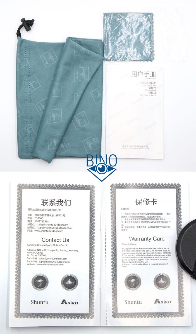 Бинокль поставлялся в коробке габаритами ДхШхВ 280х201х103мм и полным весом 1,7кг. Она изготовлена из плотного картона, внутри одно отделение. С тыльной стороны расположены две наклейки: одна с основными параметрами бинокля, вторая с логотипами компании Shuntu - Asika.