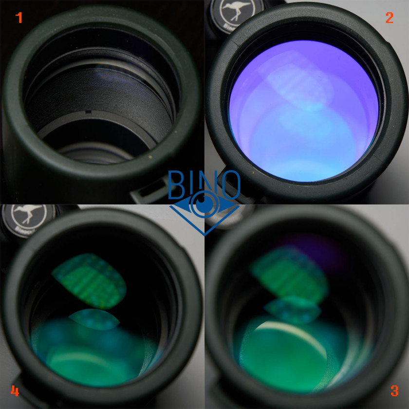 Схема объектива: одиночная линза плюс склейка-дублет. Блики от просветлений оптики объектива средней яркости, зелёно-фиолетовых оттенков. Такие же по яркости блики зелёного цвета от фокусирующей линзы, от призмы более яркие зелёные - применено полное мульти (FMC). Блики от оптики Panorama ярче, чем у SRBC 10x50.