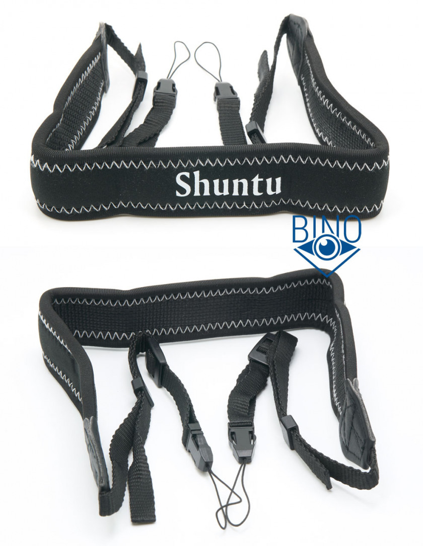 Нашейный ремешок неопреновый, простой по качеству, немного тянется. Шириной 35мм и толщиной 5мм, покрыт тканью только с наружной стороны. Он вряд ли подходит для разгрузки шеи от веса этого увесистого бинокля (910гр), я не пробовал. Этот ремешок как-будто от другого бинокля, так как слишком узкий и крепится к биноклю верёвочками на защелках. Такой слабый тип крепления характерен больше компактным х20-х25 биноклям. Проушины для ремешка по бокам тубусов бинокля металлические, достаточно выступают наружу для продевания в них тесёмок или верёвок ремешка.