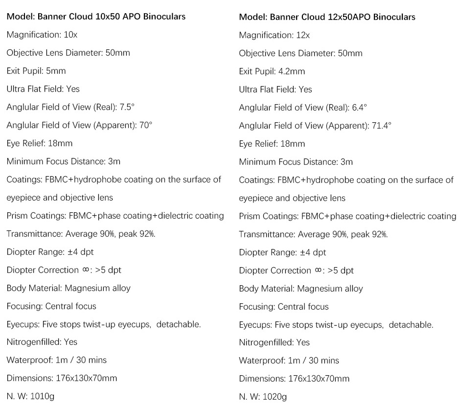 Сравнение Sky Rover Banner Cloud 10x50 APO с другими биноклями: