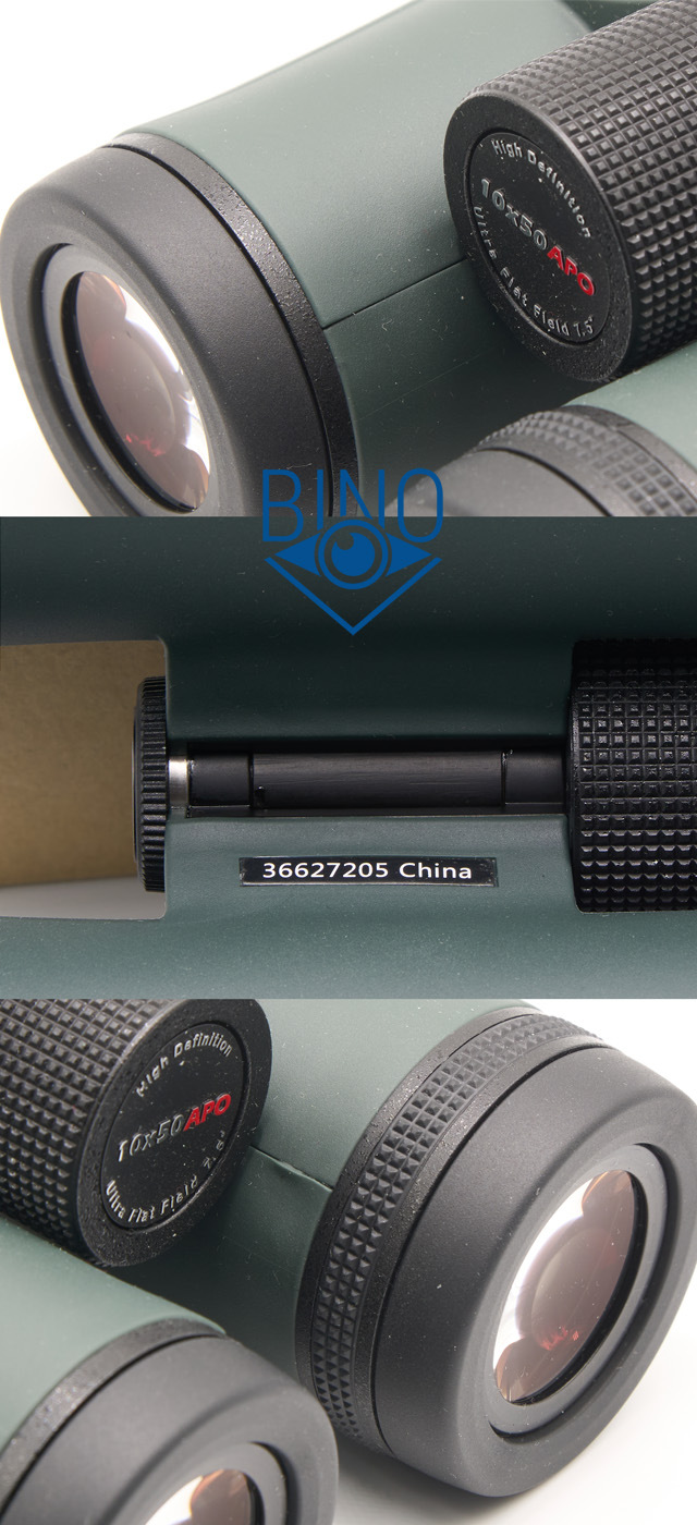 По внешнему виду и материалам бинокль выглядит почти на свою стоимость. С внутренней стороны бинокля есть бирка с серийным номером (это 205-ый экземпляр?) и указанием места производства (China). Стыки обрезинки у колеса фокусера не очень аккуратные, их хорошо видно на верхнем и нижнем фото.
