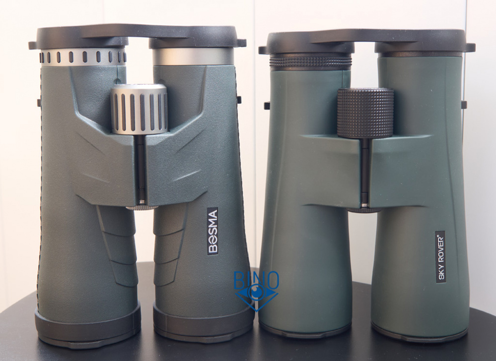 Bosma чуть крупнее и тяжелее: в длину 178мм против 175мм у Sky Rover, вес 1080гр против 1015гр у Sky Rover. Обрезинка чуть мягче и толще у Bosma, она приятнее тактильно, но выступы с внутренней стороны и более толстые тубусы хуже в удержани, так как остаётся меньше места для пальцев между ними. Sky Rover удобнее ложится мне в руки, хотя обрезинка на корпусе у него более простая, почти, как клеёнка. Показывают оба бинокля идентично, чуть лучше, чем 8х42 версия. Нарезка светозащиты внутри тубусов у Sky Rover чуть сильнее бликует, но это не сказывается на контрасте картинки, светозащита у них одинаковая. Фокусер более лёгкий у Bosma, у Sky Rover потяжелее и с более понятной обратной связью. Поставляемый с биноклем комплект лучше у Bosma, но у неё нет нашейного ремешка - вместо него харнесс (разгрузка на спину). Сумка крупнее, приятнее тактильно и удобнее в использовании у Bosma.