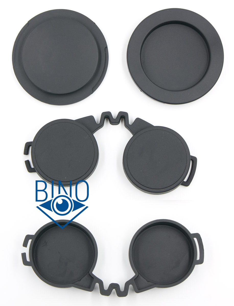 Крышки на объективы внутреннего зацепления, хорошо держатся внутри. Настолько плотно, что по бокам сделаны вырезы, чтобы поддеть их пальцами и вытянуть наружу. На новом бинокле они иногда не полностью садятся в тубусы, но не спадают при задевании. Крышки изготовлены из резины средней жёсткости, даже при +4С они дубеют и начинают трудно вытаскиваться или вставляться обратно в тубусы.