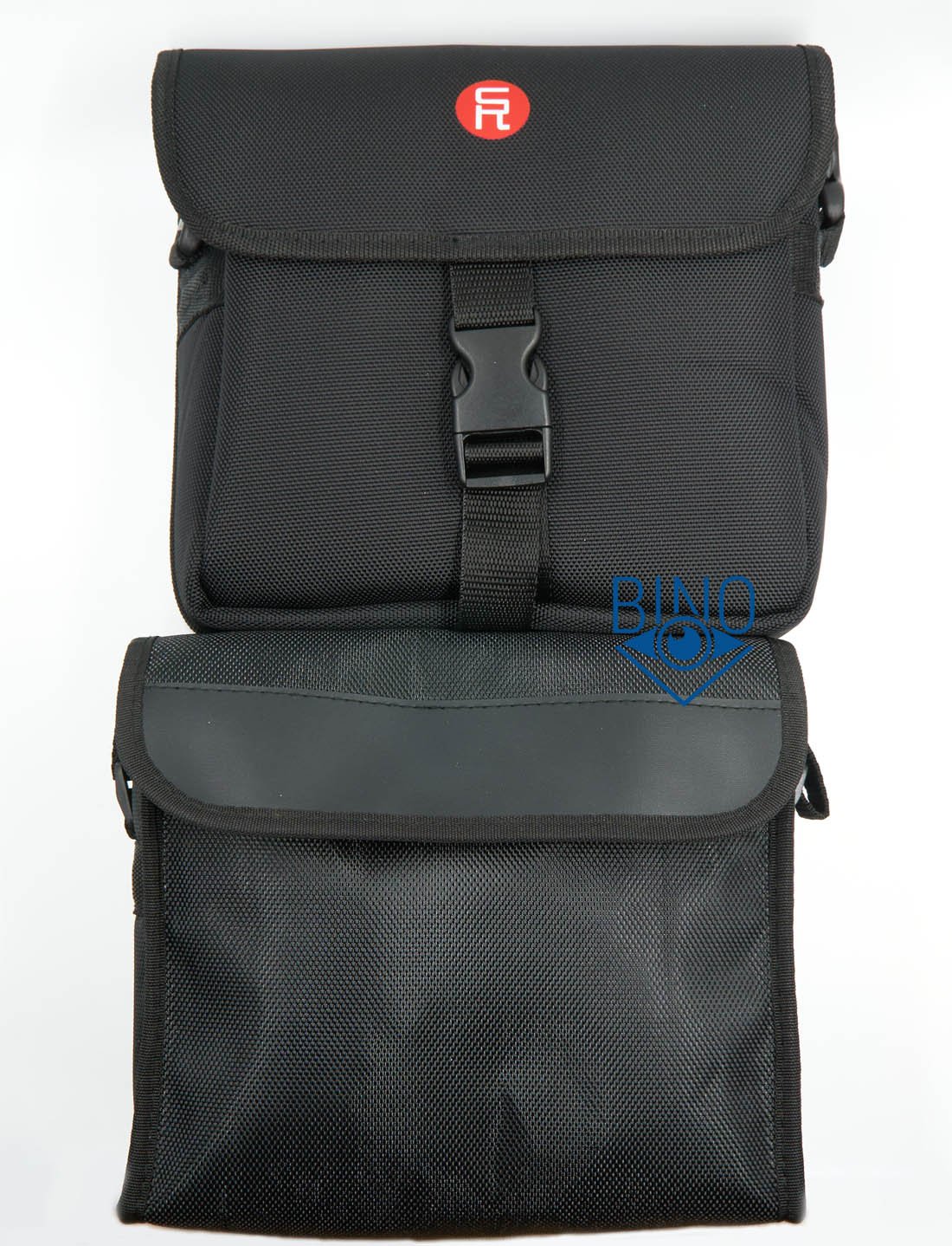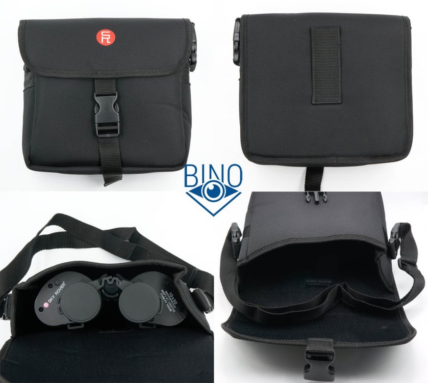 Комплектная сумка синтетическая снаружи и внутри, стенки с небольшим уплотнением для защиты от ударов, крышка закрывается на защёлку. С развёрнутыми наглазниками бинокль легко помещается внутрь, даже и поперёк сумки, крышка закрывается с убранным внутрь ремешком. Ремешок у сумки отдельный, с тыльной стороны сумки есть лямка для крепления на ремень. Габариты сумки ДхШхВ 220х220х90мм, по качеству она напоминает сумки у биноклей Eyeskey Infinity или Nikon P7, почти такая же мягкая, и не очень хорошо держит форму.