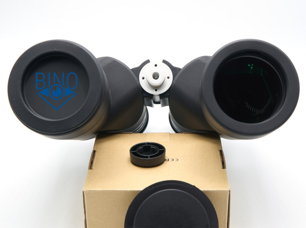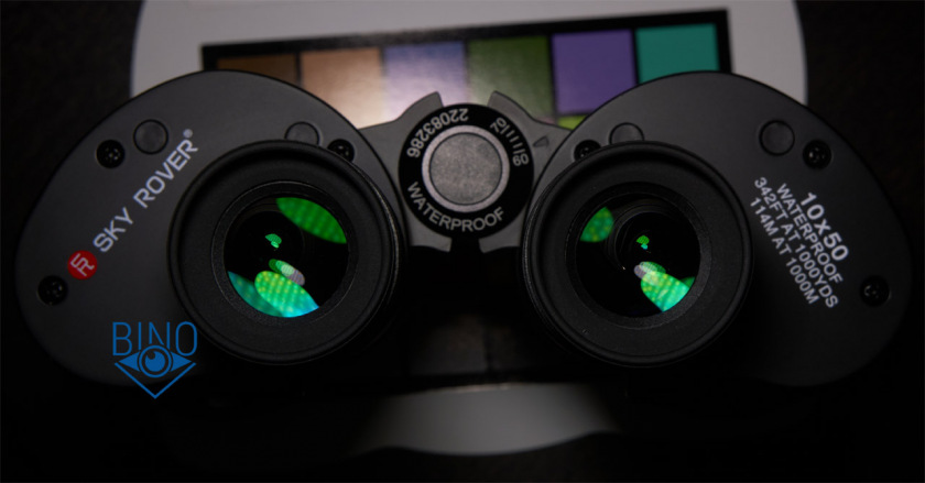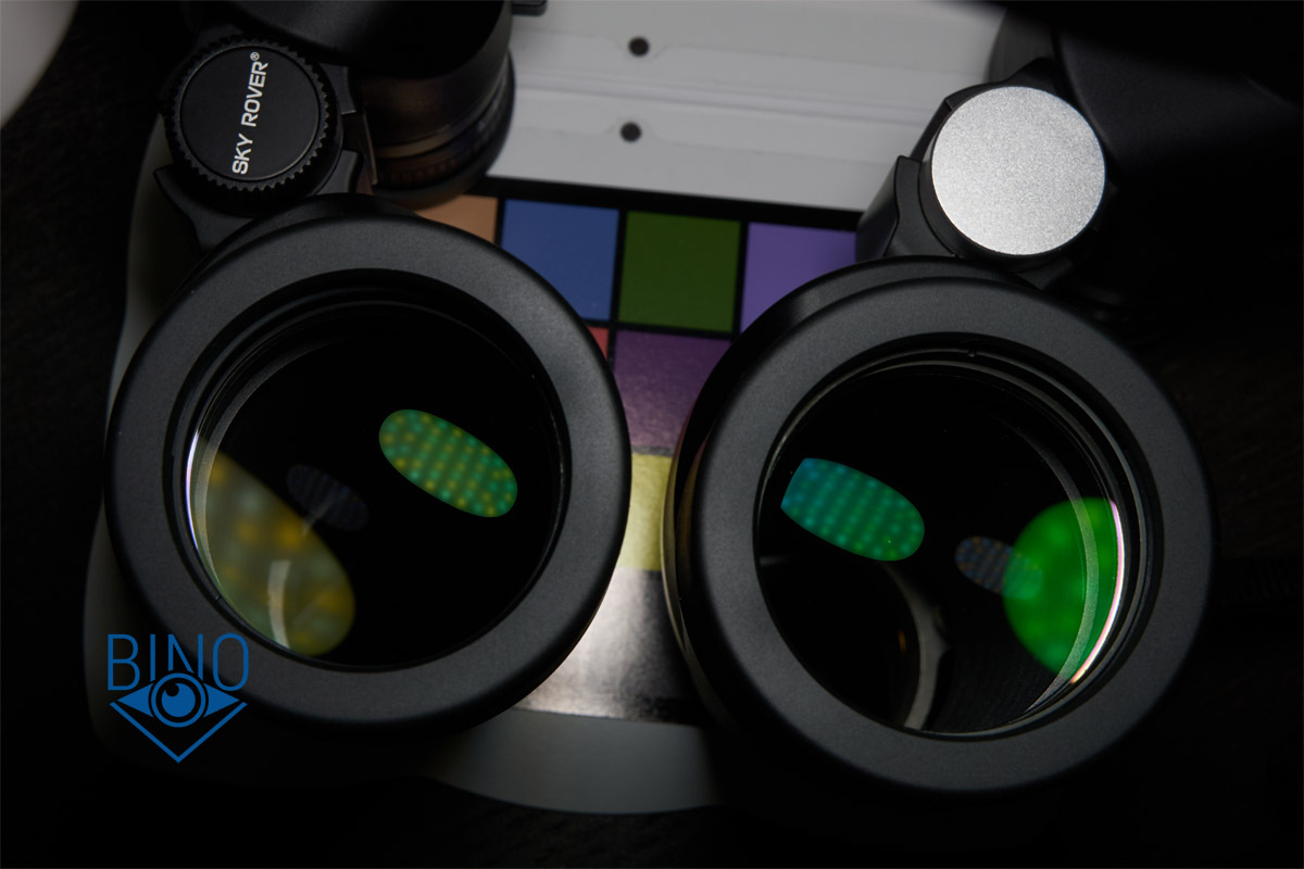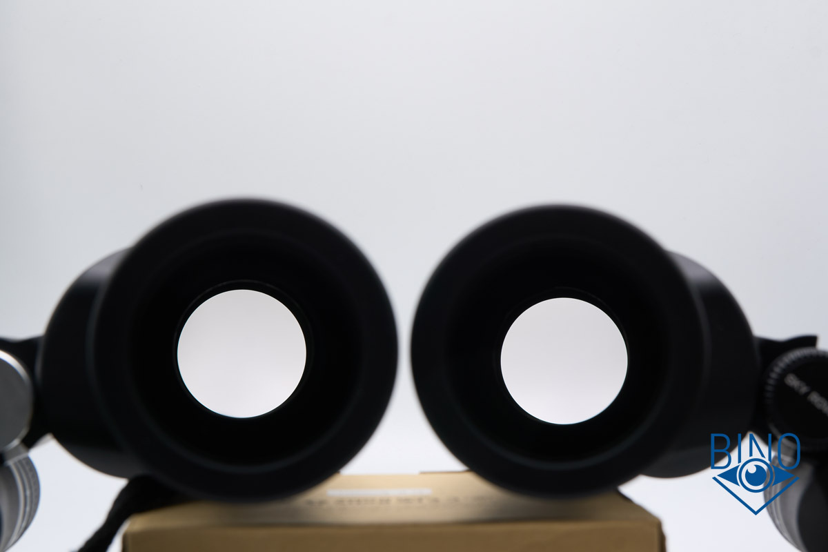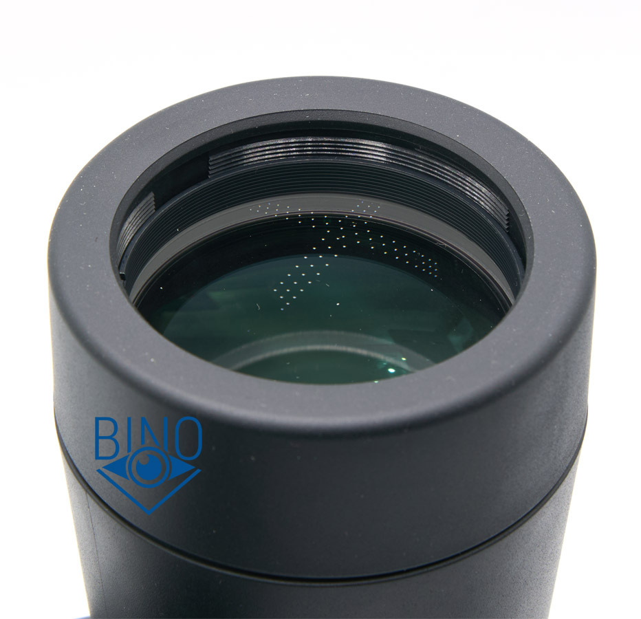 Просвет у стопорных колец объектива около 49,7-50мм в зависимости от места и тубуса измерений, действующая апертура по тесту фонариком получилась около 48,5-49мм. Наружная линза объектива выпуклая, утоплена от края тубуса внутрь на 10мм по центру и на 12мм по краю. Обрезинка загибается вокруг торца тубусов, формируя плоский край, постановка бинокля на стол гулкая из-за веса. Снаружи объектива на стопорном кольце есть нарезка светозащиты, дальше внутри тубусов встречается широкая конусная бленда, оканчивающаяся светоотсекающей диафрагмой, и потом опять идёт нарезка светозащиты на всей поверхности тубуса до призменной диафрагмы. Внутренности тубусов выполнены нормально, с достаточным серением поверхностей, призменная диафрагма, похоже, не окрашена. Торцы наружной линзы объектива не зачернены, но расположены шире оптического тракта, есть также поблескивание по окружности, как-будто не хватает просветлений по краю этой линзы, что характерно китайской оптике.