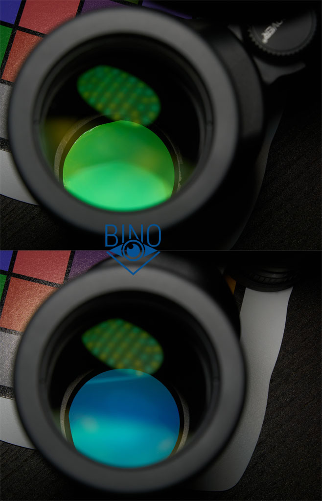 Цвет бликов от наружной поверхности призмы отличается в правом и левом тубусах, видимо, они с разных партий. На фото верхнее фото левого тубуса, нижнее - правого.