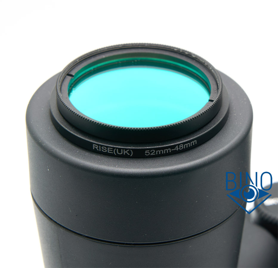 Переходник 50,5мм входит в тубус свободно, не вкручивается и не держится внутри. Переходник 52мм входит с трудом, до остатков "резьбы" не достаёт, но цепляется за края загнутой обрезинки и немного держится внутри тубуса перед объективом. Если сильно не трясти биноклем из стороны в сторону, то таким образом вполне можно наблюдать с фильтрами. Действующая апертура при этом режется установленным фильтром, на моём тесте получилась около 43мм.