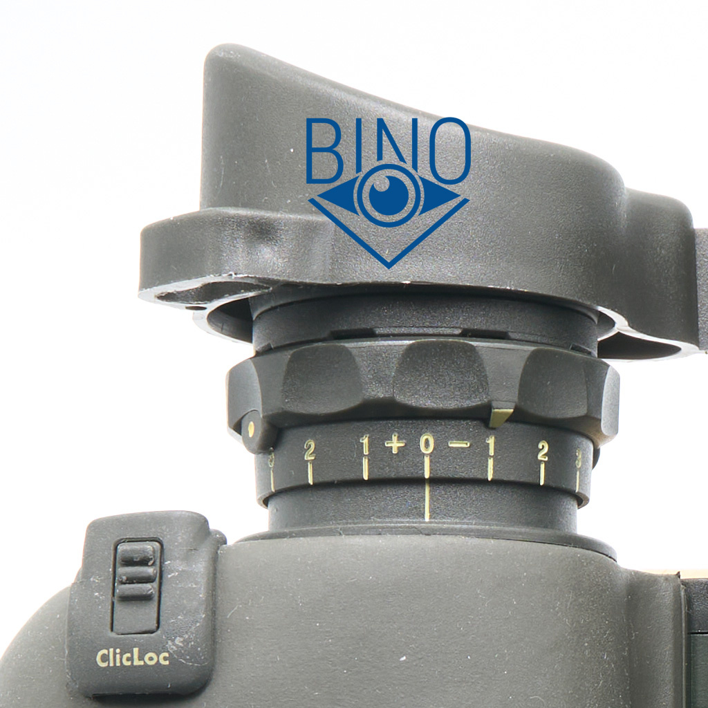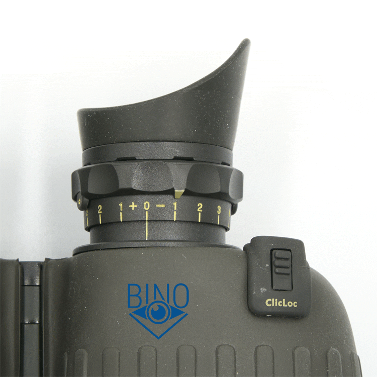 Для удобства вращения окуляров на них есть пластиковые кольца с углублениями под пальцы. По бокам колец расположены стопоры с жёлтой меткой, если их нажать, то кольцо можно поднять вверх и повернуть в любую сторону. На каждом кольце есть как бы стрелка-указатель, которой можно пометить нужное положение окуляров для фокуса на бесконечность. Для отметки нуля и сделали эти кольца вращающимися, на фото указатель смотрит на -1. Позднее (примерно в 2009 году) конструкцию окуляров упростили и убрали эти наружные кольца.