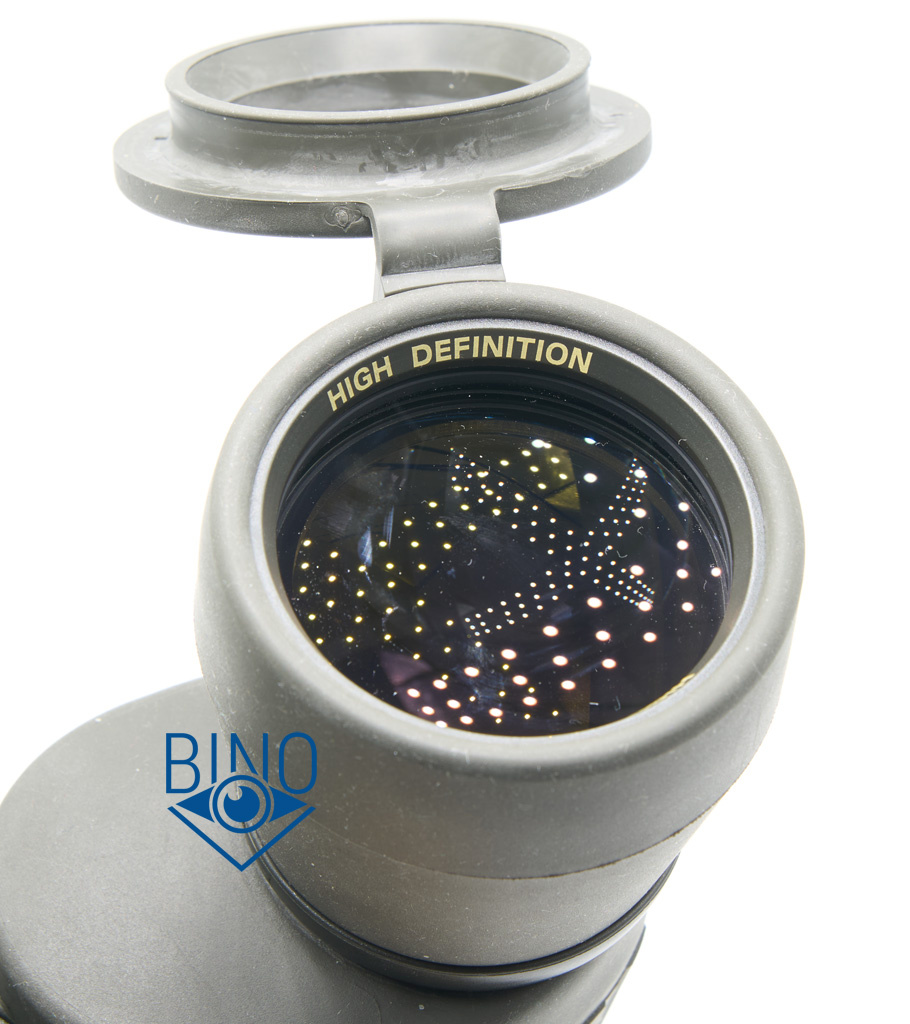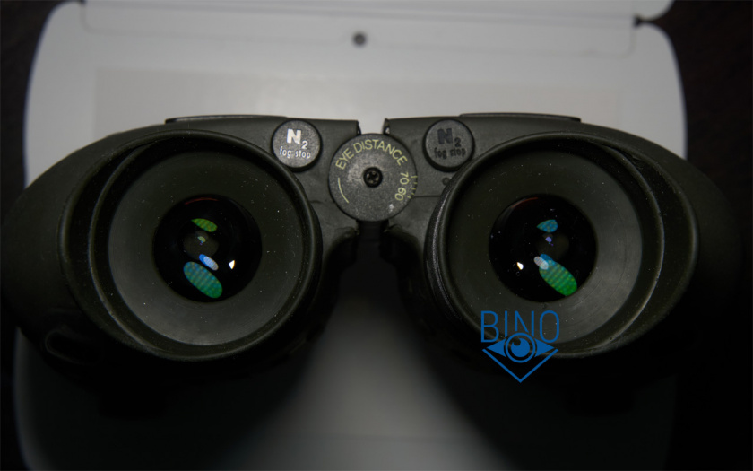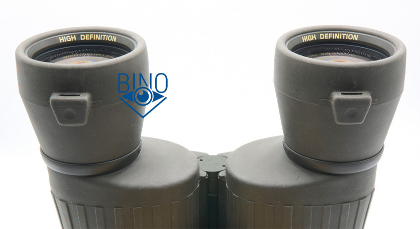 Края линз объективов зачернены, расположены шире оптического тракта и закрыты наружными стопорными кольцами. Диаметр просвета между ними 50мм, действующая апертура по тесту фонариком получилась тоже 50мм. Снаружи объективов обрезинка загибается в виде выпуклого бампера, постановка бинокля на стол мягкая, несмотря на его вес. Наружная линза объектива утоплена от края на 7,3мм по центру и на 10мм по краю. Крышки на объективы твёрдые (пластиковые) и не продавливаются пальцем, касания наружной линзы не будет. Внутренности тубусов выглядят аккуратно выполненными и хорошо матированными, хотя светоотсекающих диафрагм или нарезки светозащиты внутри нет, призменная диафрагма, сформированная сужающимся цилиндром внутри тубусов, окрашена.