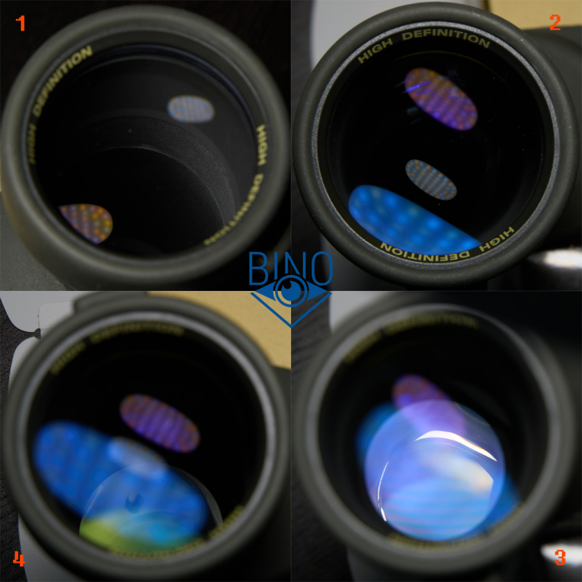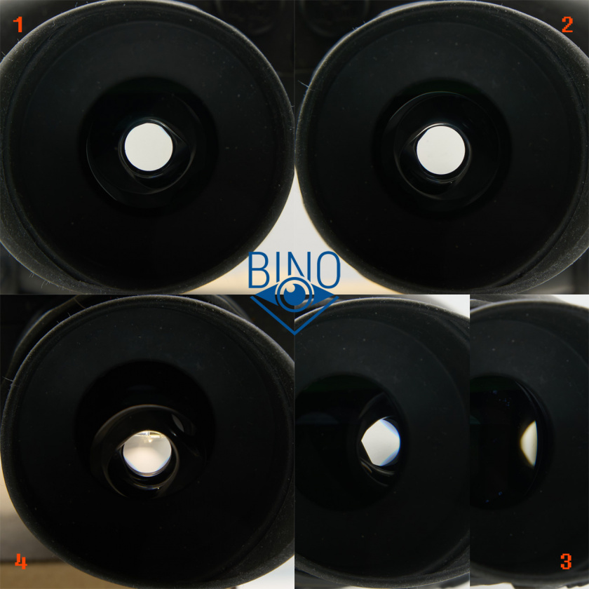 На фото выше (слева): 1 - выходной зрачок левого канала, 2 - вз правого канала, 3 - вз на краю (оценка виньетирования), 4 - имитация наблюдений в сторону Солнца (подсветил объектив сверху фонариком смартфона).