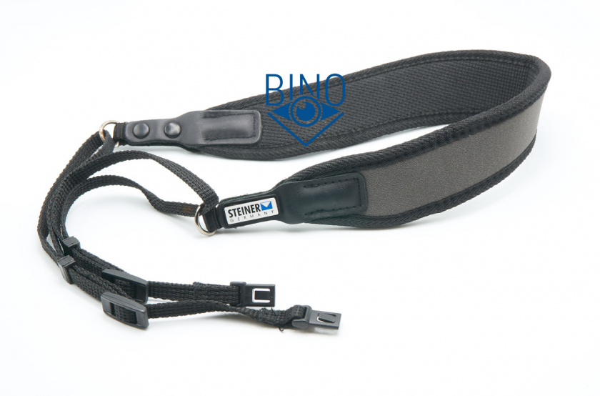 Нашейный ремешок неопреновый, шириной около 40мм и толщиной около 6мм. По параметрам ремешок скромный, но, на удивление, справляется с разгрузкой шеи от этого массивного бинокля весом 920гр. Ремешок оканчивается тесёмками, которые регулируют его длину в небольших пределах, высоко на груди бинокль не подвесить. К биноклю ремешок крепится через фирменные клипсы ClicLoc, сторонний ремешок не применить.