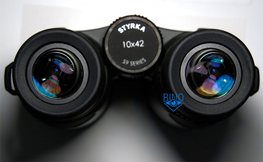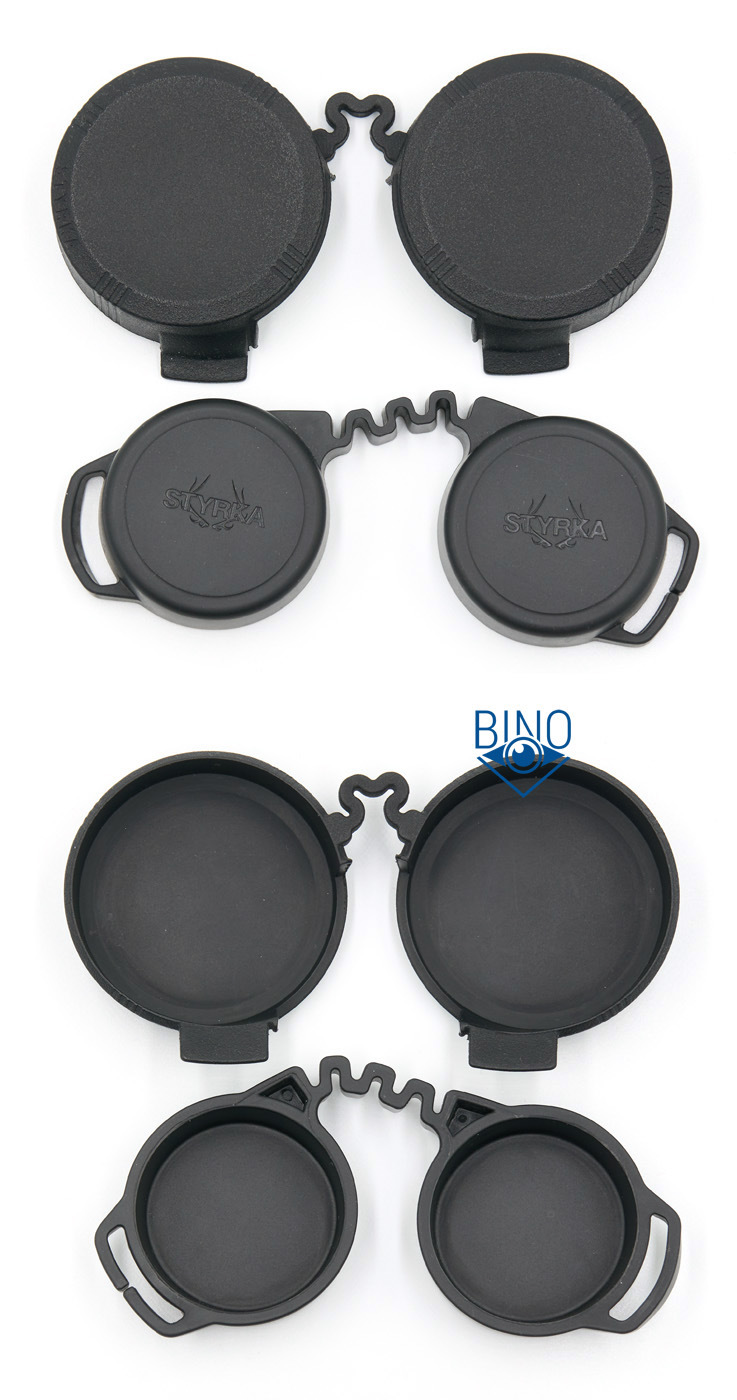 Крышки на объективы сдвоенные, в закрытом состоянии не позволяют свести тубусы на минимальное значение МЗР. Выполнены из мягкой резины, не дубеют на морозе. Они фирменные, с надписью STYRKA на внешней стороне. Надеваются на тубусы выступами под пальцы наверх, есть вырезанный сектор сбоку под наружный мост. Легко снимаются и надеваются, могут остаться в сумке при вынимании бинокля наружу.