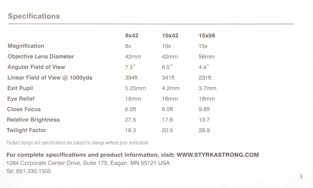 Американская компания Styrka специализировалась на продаже оптики (прицелы, бинокли, зрительные трубы), появилась лет 9 назад одной из последних в списке Athlon, GPO, Maven, Tract, Styrka. Также, как и остальные компании, она заказывала производство биноклей на сторонних фабриках, но выставляла их на официальном сайте почти по своей максимальной стоимости, я не помню особых скидок. Возможно, это сказалось на объёмах продаж и привело к закрытию компании во время пандемии Коронавируса в 2020 году.