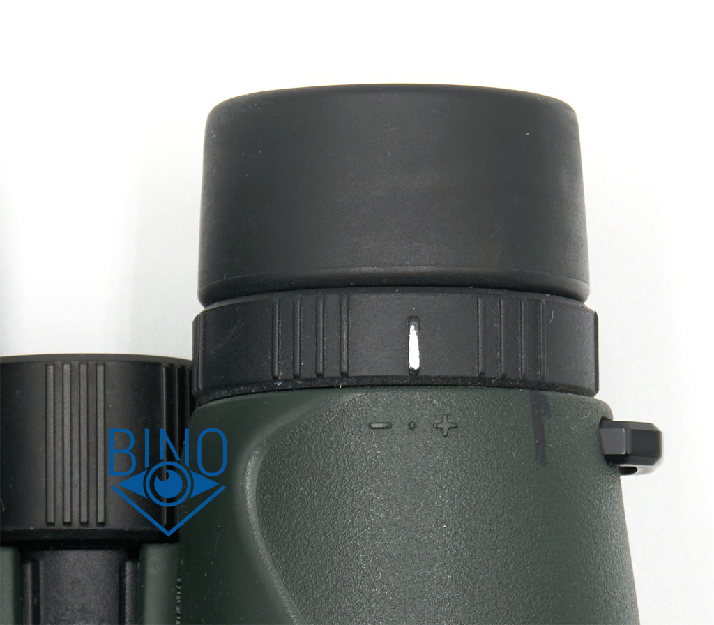 При вращении правый окуляр выдвигается наружу внутри наглазника или задвигается внутрь. На тубусе нулевая метка выступает над корпусом, но плохо ощущается между знаками минус и плюс, на кольце же метка сразу опознаётся на ощупь. В темноте можно примерно выставить нулевое положение по меткам, но в реальности оно намного правее - владелец бинокля даже сделал пометку ручкой на обрезинке.
