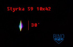 Резкость на оси у S9 хорошая - очень хорошая, чуть уступает моему лидеру Zeiss Conquest HD 10x32. Разница в резкости едва видна при сравнении с рук, при установке биноклей на штатив становится более заметна, как и разница в разрешении в пользу Styrka из-за апертуры х42 против х32. Дополнительное увеличение с бустером 4х S9 держит похуже Zeiss Conquest HD 10x32, похоже её сборке уделялось чуть меньше внимания. Контраст у этих биноклей сравним.