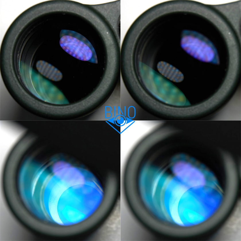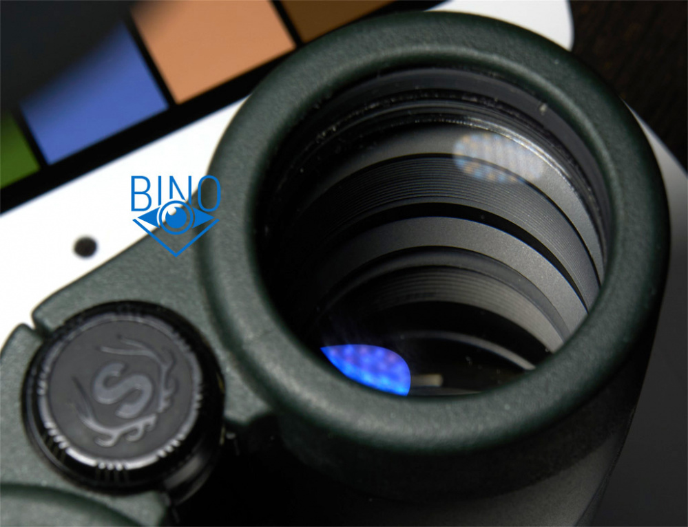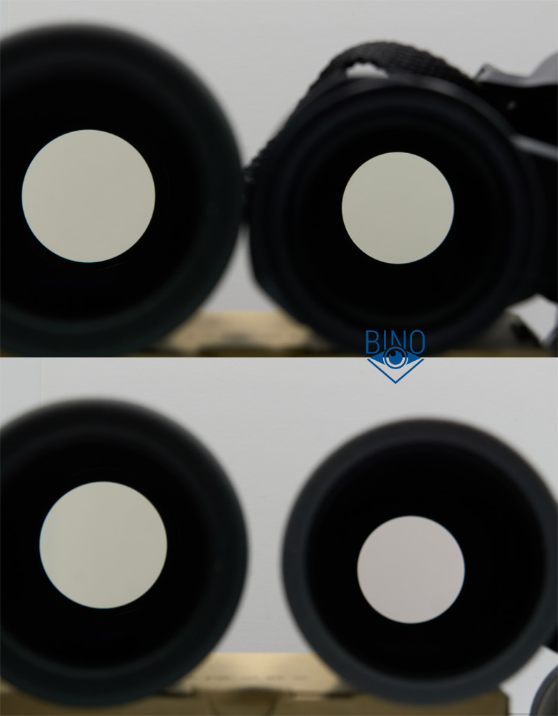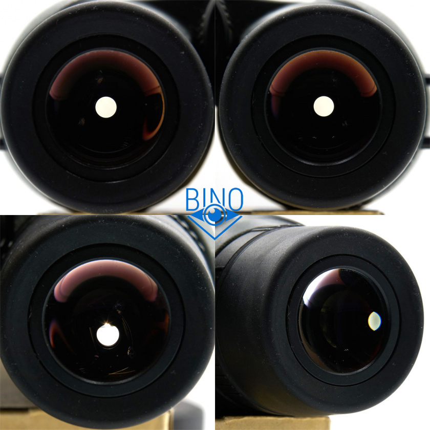 Просвет у объективов около 42мм, действующая апертура по моему замеру получилась тоже около 42мм. Первая линза объектива утоплена от края тубуса внутрь на 9мм по центру и на 11мм по краю. Обрезинка загибается вокруг торца тубусов у объективов, формируя неплохой демпфер, постановка бинокля на стол мягкая. Внутри тубусов есть светоотсекающие диафрагмы перед фокусирующей линзой и много нарезки светозащиты, которая бликует заметно меньше, чем аналогичная у Zeiss Conquest HD. Внутренности тубусов выглядят аккуратно выполненными и хорошо матированными, призменная диафрагма окрашена. Края линз объектива нечернены, но расположены шире оптического тракта.