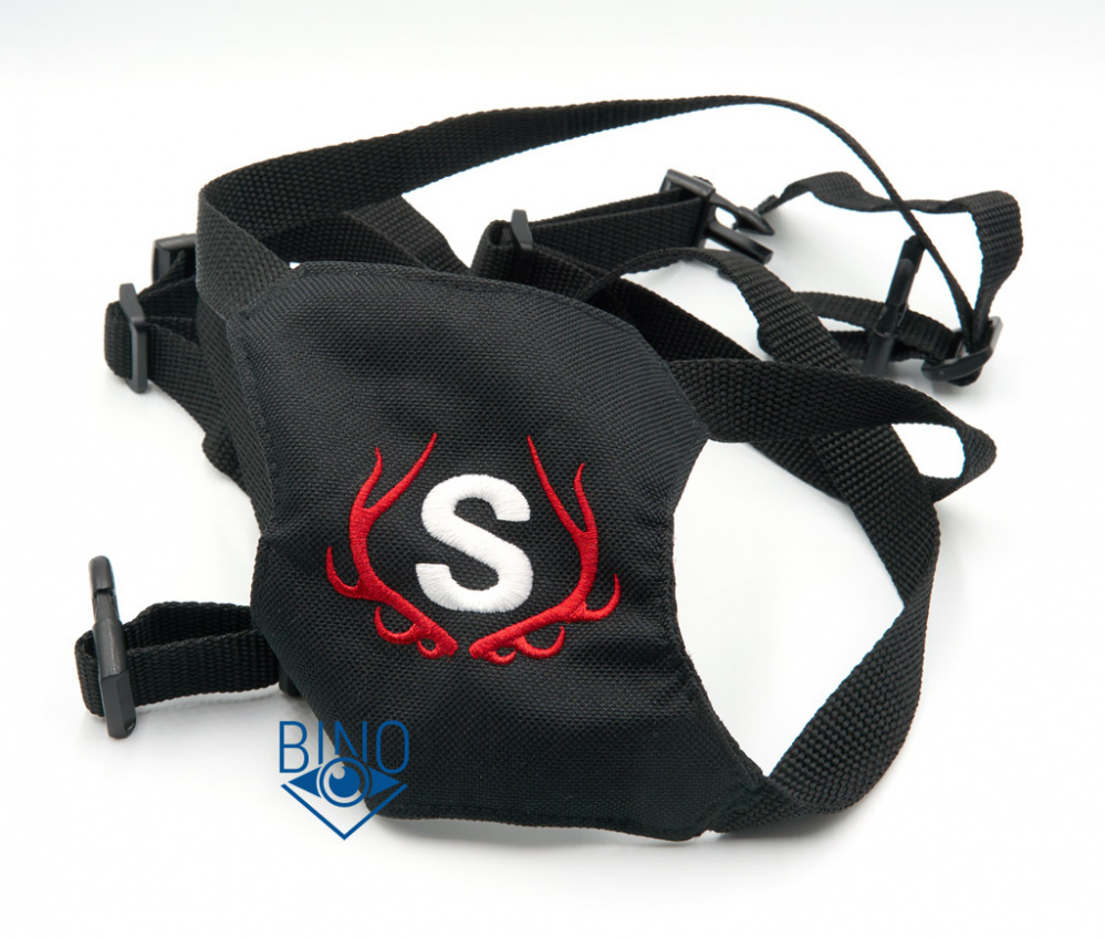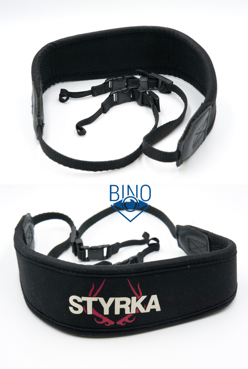 Нашейный ремешок неопреновый, шириной 55мм и толщиной 5мм. Хорошо тянется, подходит по параметрам для разгрузки шеи от такого вполне увесистого бинокля (885гр). Крепление ремешка к биноклю осуществляется через отстёгивающиеся клипсы, это один из любимых типов крепления у охотников. Тесёмки можно регулировать по длине.