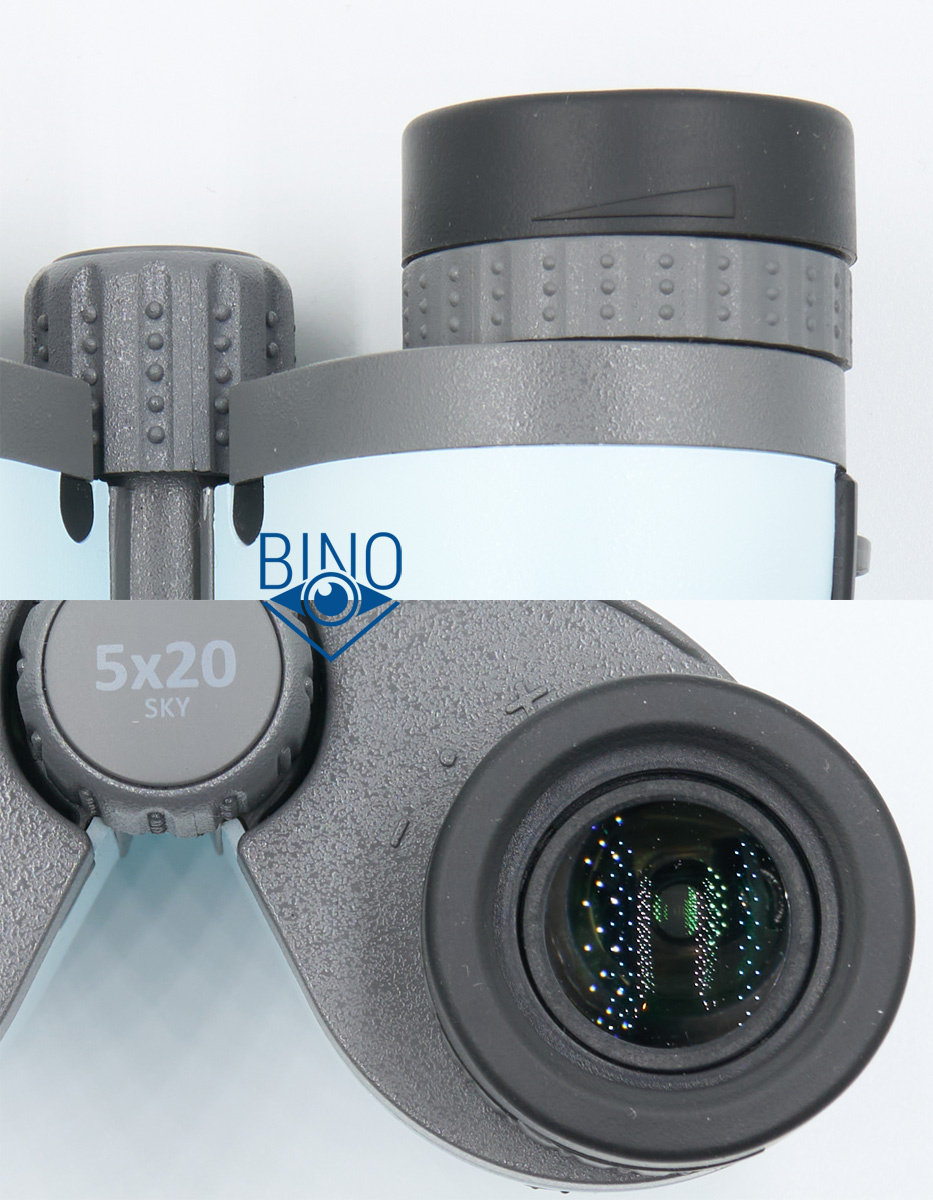 Диоптрийная коррекция выполнена под правым окуляром в виде пластикового рифлёного кольца, которое стилизовано насечками под колесо фокусера. Под левым окуляром есть такое же пластиковое кольцо (без рифления) для симметрии. Кольцо может сбиваться со своего положения при случайном задевании. Вращение плавное без ступенек и лёгкое, на 35 градусов влево от нулевой метки и на 30 градусов вправо.