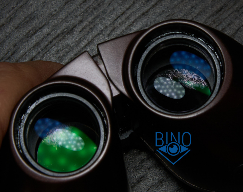 Схема объектива у биноклей склейка-дублет, дальше (глубже) идёт призма. Блики от просветлений оптики объектива у Прима обычных зелёных оттенков и яркости выше средней, от призмы зелёно-фиолетовые - везде полное мульти (FMC).