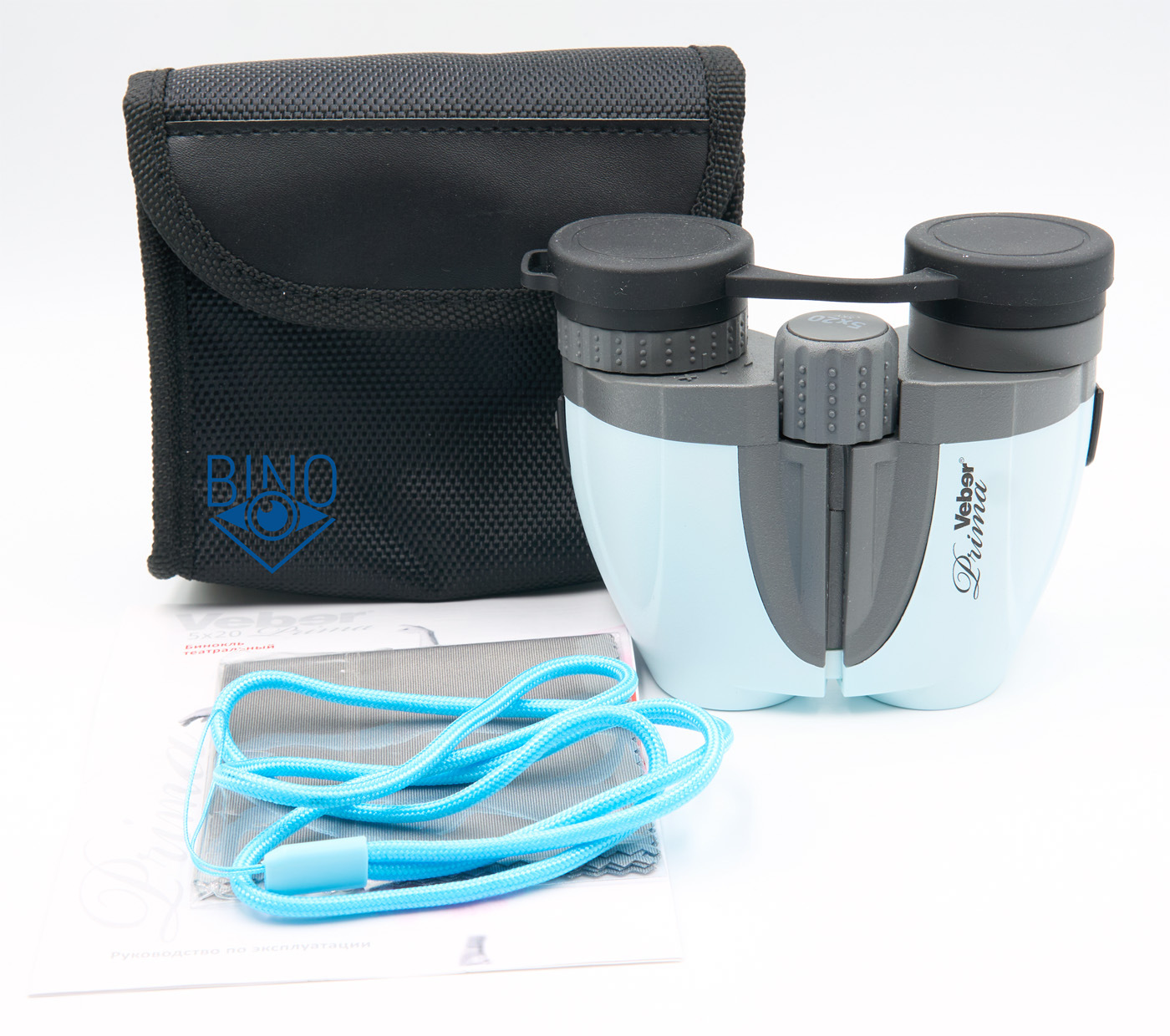 Бинокль Veber Prima 5x20 поставляется в небольшой коробке весом 330гр, габаритами 125х105х65мм. После того, как увидишь коробку или инструкцию, становится понятно откуда название бинокля (оно не от марки сигарет), и почему Вебер разместил эту модель в разделе театральные бинокли.
