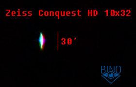При правильном позиционировании глаза ХА на оси слегка заметна на контрастных сценах. Однако маленький выходной зрачок и неудачные по форме наглазники способствуют смещению глаза с оси, что усиливает хроматизм, и он становится хорошо виден даже на неконтрастных сценах на оси. Из-за этого может сложиться неправильное представление, что у Conquest HD хроматизм среднего уровня. Также этому впечатлению способствуют насыщенные по цвету каёмки по краю поля зрения, жёлтого и синего цветов. К примеру, при наблюдении леса против Солнца ветки ели начинают тонуть в фиолетовых тенях по краю, голые ветки кустов на фоне снега тоже заметно окрашены с середины поля зрения.