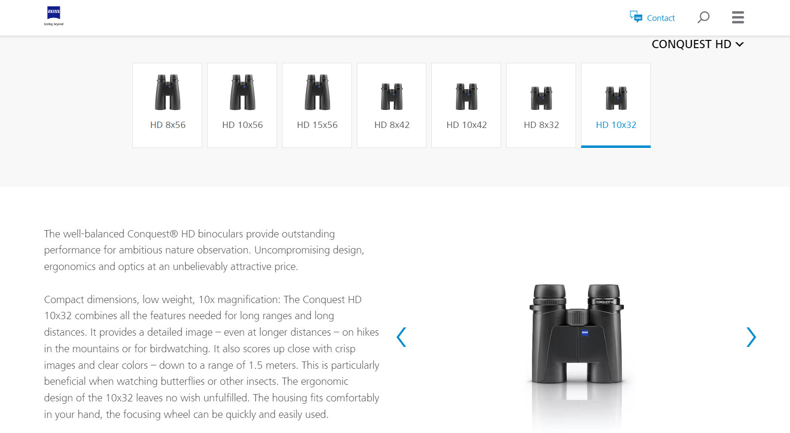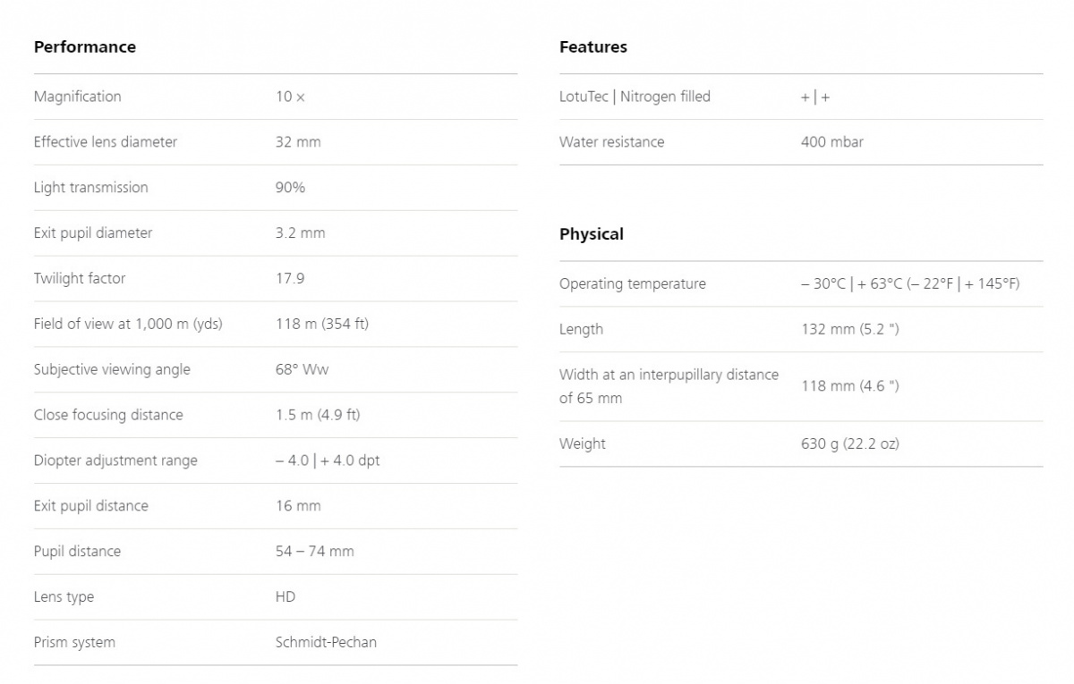 Zeiss Conquest HD - отличный бинокль! Очень хорошо показывает, мне нравится. Формат 10х32, особенно на таком уровне исполнения, удобен днём, нет ощущения недостатка яркости или тёмности бинокля, так как у него светопропускание под 90%. Выходного зрачка в 3,2мм вполне хватает даже пасмурным днём и при использовании на воде с лодки. CHD становится тёмным только при закате Солнца и потом в сумерках или ночью проигрывает формату 10х42. Также требует чуть точнее позиционировать глаз в выходном зрачке бинокля. Зато вес бинокля меньше на 150гр (по сравнению с версией 10х42), это вполне ощущается при ношении бинокля на шее даже через 20 минут прогулки. Плюс размеры бинокля компактнее и сумка занимает меньше места, что хорошо подходит для пеших прогулок и дневных наблюдений.