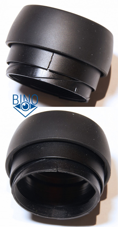 По форме наглазники немного расширяются к основанию: снизу Д=43мм, сверху Д=38мм. Верхняя плоскость в виде узкой полоски шириной всего 2мм, затем идёт спад с Д=33,5мм до внутреннего просвета Д=30мм. Ход наружу у наглазников легкий, но фиксация на каждом шаге (особенно последнем) тяжёлая, хотя они и фиксируются хорошо с щелчком. Выдвигаются наружу на 3 шага, на трении вполне держатся и между шагами в промежуточном положении.