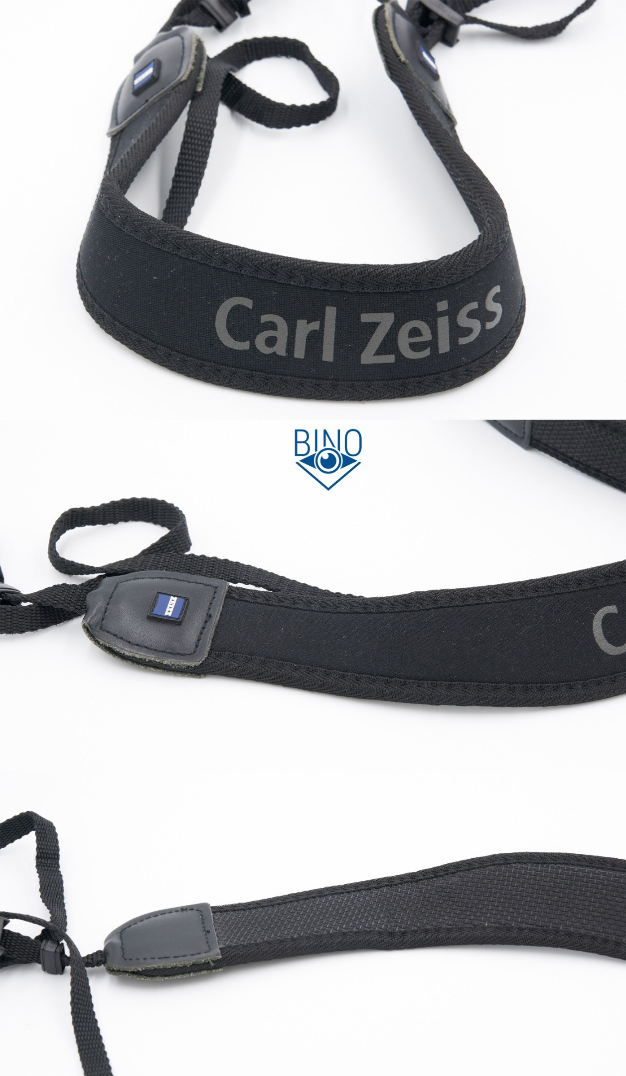 Нашейный ремешок один из самых хороших на рынке, именно его китайцы копируют для своих биноклей. Надпись Carl Zeiss не так давно сократили до Zeiss. Ремешок прорезинен и хорошо тянется под весом бинокля, подходит для разгрузки х32 (640гр) и х42 моделей (800гр), через час ношения бинокля шея не устаёт. Длина ремешка без тесёмок 42см, ширина по центру 41мм, по краю 36мм, толщина 5мм.
