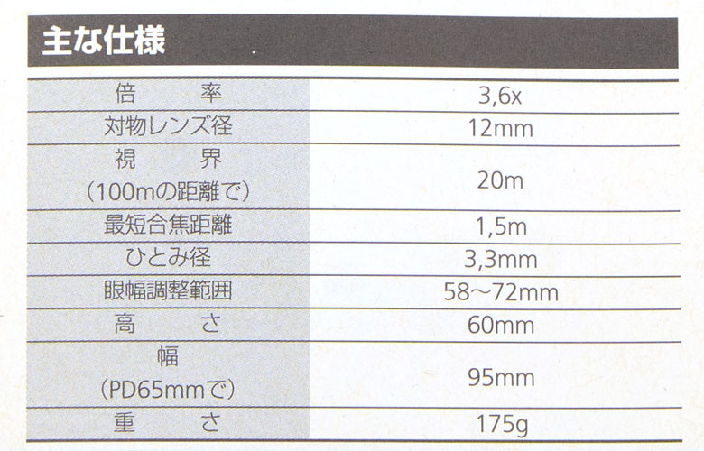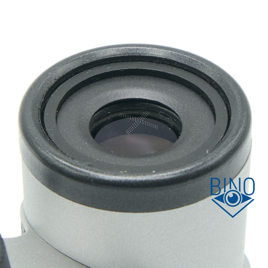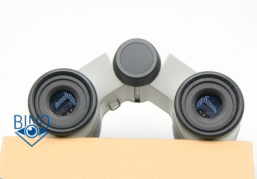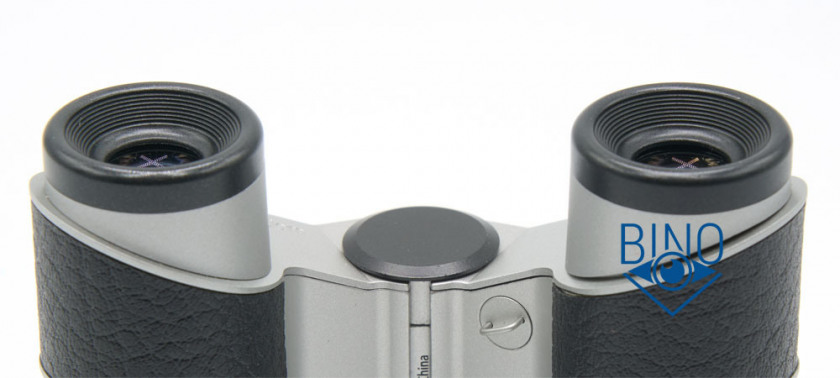 Схема объектива: склейка-дублет. Блики от просветлений оптики объектива выше средней яркости, фиолетово-синих оттенков. Похоже, что наружная линза выполнена с однослойкой. Такие же по яркости жёлтых цветов блики от призмы, бинокль с MC просветлениями. Блики от оптики ярче, чем у Nikon Mikron 6x15 современного производства.
