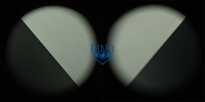 Похоже, что у этого бинокля отсутствует фазовая коррекция, я давно хотел такое посмотреть. Тест с поляризационным фильтром на просвет через объективы на монитор показал 100% перепад в яркости между половинками апертуры, заметно сильнее, чем у Canon 8x32 WP, и без цветного окрашивания. На фото ниже демонстрация перепада слева через правый канал, справа через левый:
