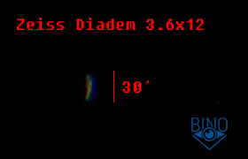 Дисторсия (та её часть, что вызывает искривление прямых линий, проходящих через поле зрения) у Diadem положительная (подушка), слабого уровня; слабее, чем у Zeiss Conquest HD 10x32.