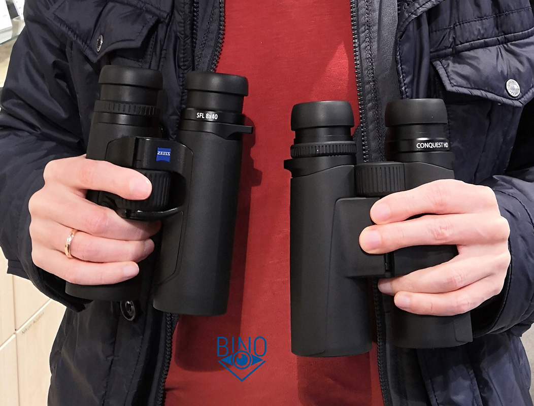 Мне удалось посмотреть версию SFL 8x40 (SFL) в магазине и сравнить с Conquest HD 8x42 (CHD). В магазине был теплый яркий свет, за окном около 5 вечера. В основном сравнивал сквозь витрину по стене дома, освещенного Солнцем, через дорогу на расстоянии около 15 метров. Делюсь своими впечатлениями.