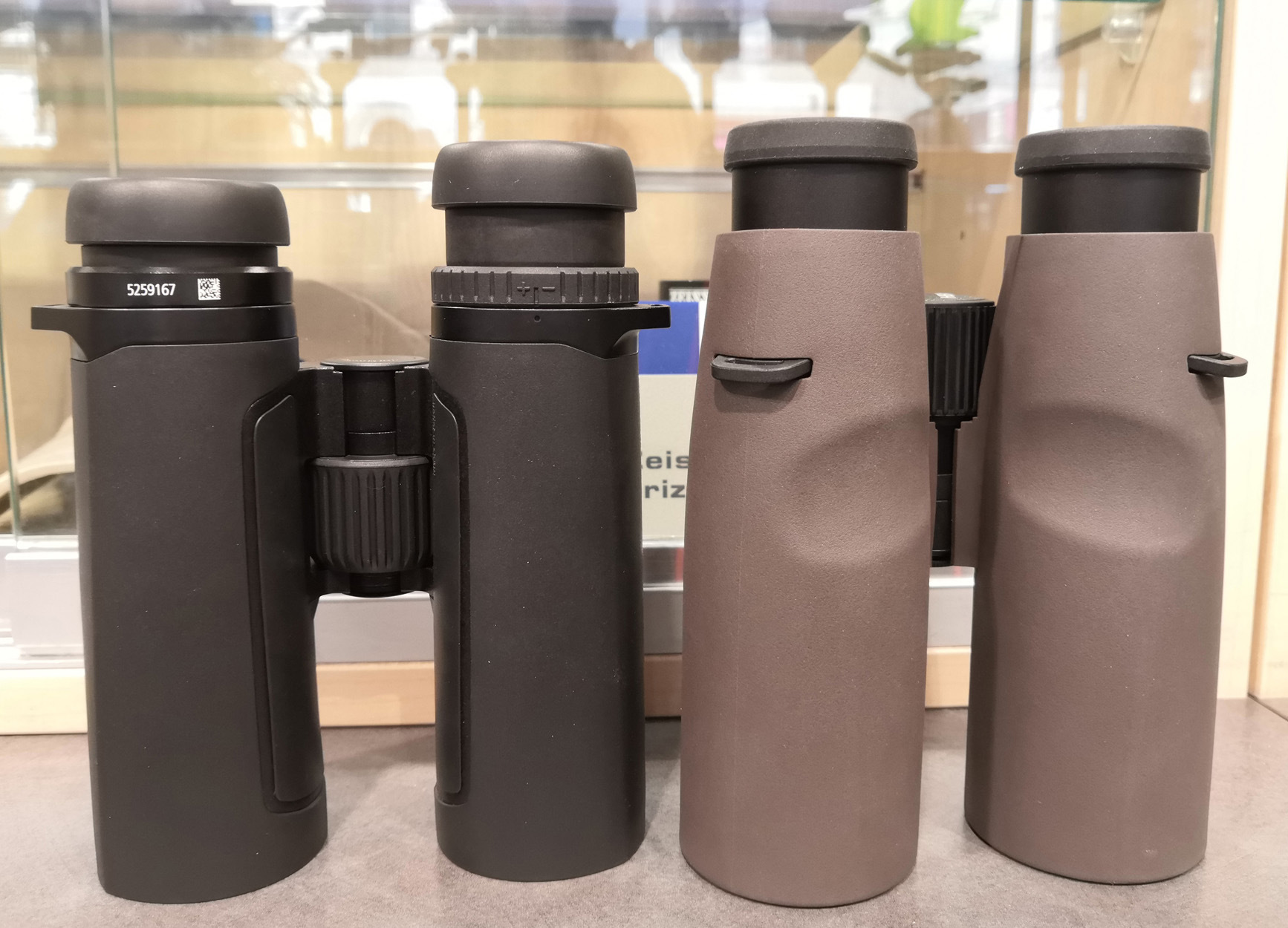 Со стороны объективов обрезинка загибается внутрь, формируя плоскость у обоих биноклей. Постановка на стол более-менее мягкая и надёжная. Стенка тубуса бинокля выглядит потолще у CHD. У него также глубже утоплены линзы от края тубуса. По отзывам в сети у SFL применён поликарбонат в корпусе, поэтому оставили мост из сплава металлов снаружи неприкрытый для усиления. CHD теоретически (и по описанию на официальном сайте) более крепкий и выносливый в эксплуатации.