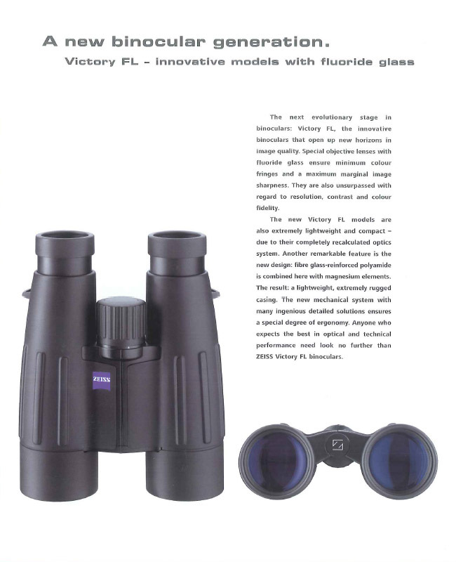 Линейка биноклей Victory FL появилась в 2004 году, этот бинокль, произведенный в 2005 году, уже его вторая ревизия. В ней поменяли форму наглазников сверху (сделали более узкими) и крышки на объективы, которые были не очень удобными в эксплуатации, и Zeiss быстро выпустил замену. Получается, что хотя этот бинокль и из первых партий, но уже с заменёнными наглазниками, благо они скручиваются с окуляров и могут быть заменены отдельно. Новые наглазники можно было заказать раньше напрямую у производителя, сейчас из-за санкций в РФ ничего не высылают.