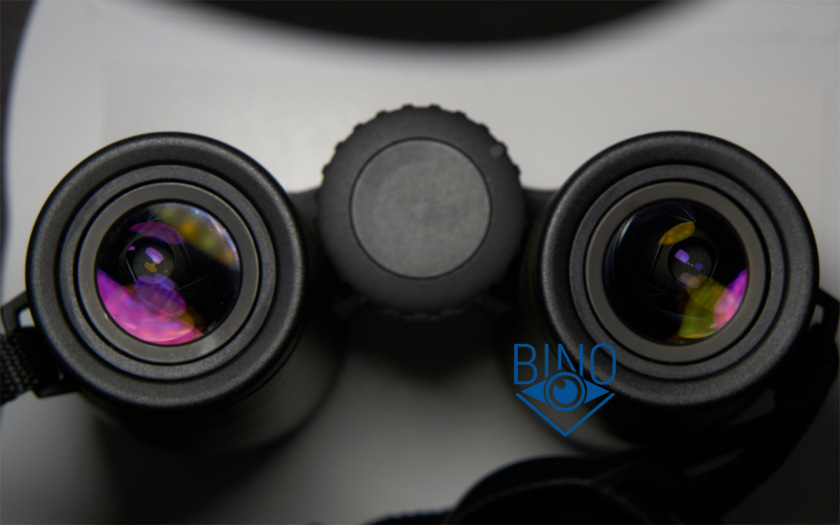 Схема объектива: одиночная линза плюс склейка-дублет. Блики от просветлений оптики объектива невысокой яркости, зелёных и красных оттенков. Такие же по яркости блики фиолетовых оттенков от фокусирующей линзы и от призмы - применено полное мульти (FMC). Цвета бликов от фокусирующей линзы отличаются для левого и правого тубусов. Блики от оптики по интенсивности сравнимы с Conquest HD и SRBC, если не ярче.