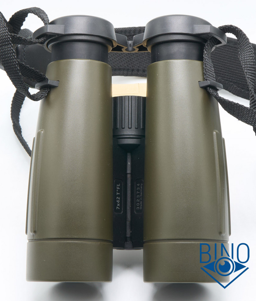 По внешнему виду и материалам бинокль выглядит на свою стоимость. Тактильно материалы приятны, это действительно премиум и не только по стоимости. C внутренней стороны моста правого тубуса есть шильдик с серийным номером и указанием места производства Made in Germany, на левом - шильдик с указанием модели 7x42 T* FL. T* - это обозначение топовых просветлений оптики у Zeiss, по этой аббревиатуре линейку Victory FL иногда называют TFL. Позже производитель перестал указывать букву T на новых линейках биноклей, а название линейки Victory FL добавил на переднюю часть бинокля.
